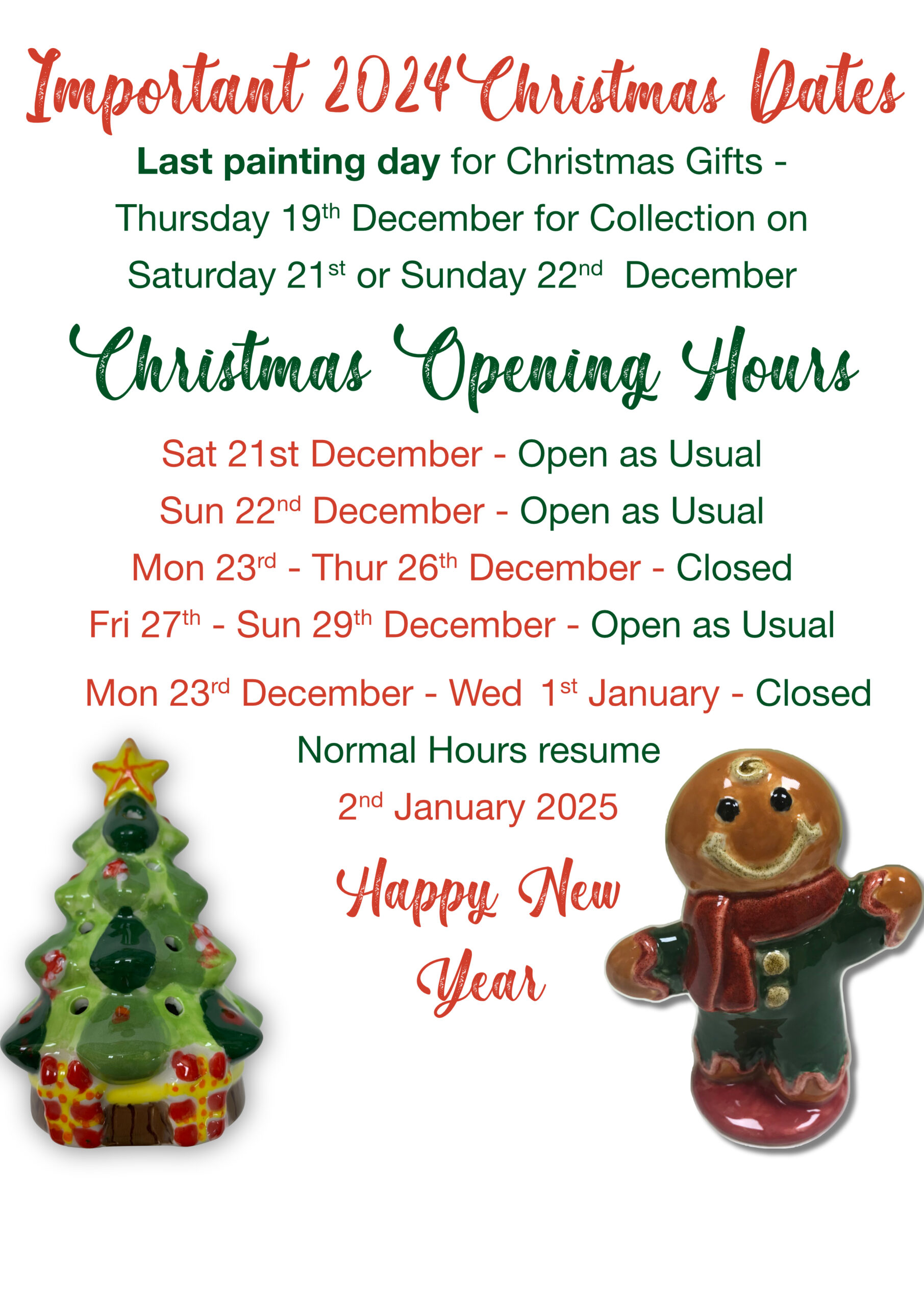 Hello! Please read the dates carefully as we really don't want to disappoint anyone with our last days to paint and collection dates.