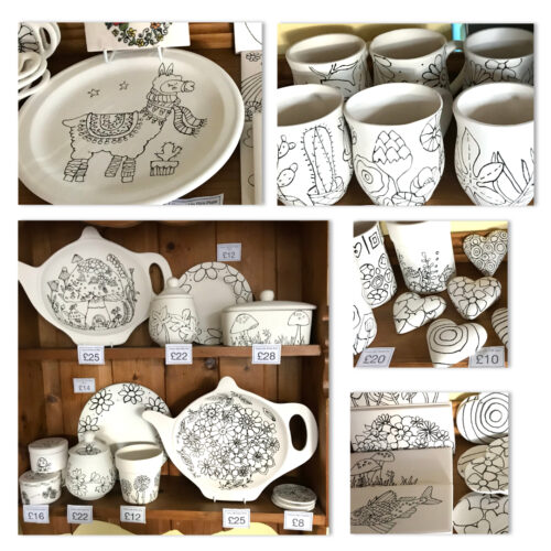 We have taken inspiration from the colouring craze that has been around now for a few years. If you take a little look at the picture you will see a selection of items that have black outlined images on them. We have drawn pictures with the black writer and then the pots have been fired in the kiln so that the lines won't rub off when you come to colour them in.