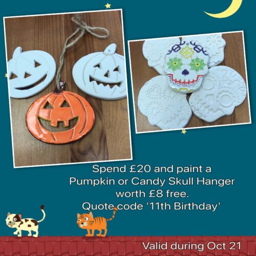 Over the Half Term period if you spend £20 in the studio on other pottery item someone gets to paint a pumpkin or candy skull hanger (worth £8) for free. We aren't even going to limit it to one per family so if you spend £40 you can paint two! Naturally it is whilst stocks last.