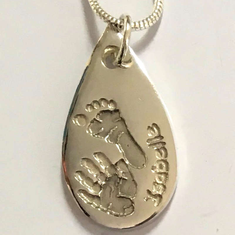 As well as ceramic keepsakes we also offer silver jewellery baby imprints. Prices start at around £65 for a pendant. We have lots of different shapes to choose from. If you would like to know more pop in to the studio and have a look at our brochure.