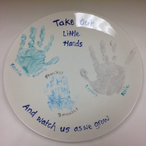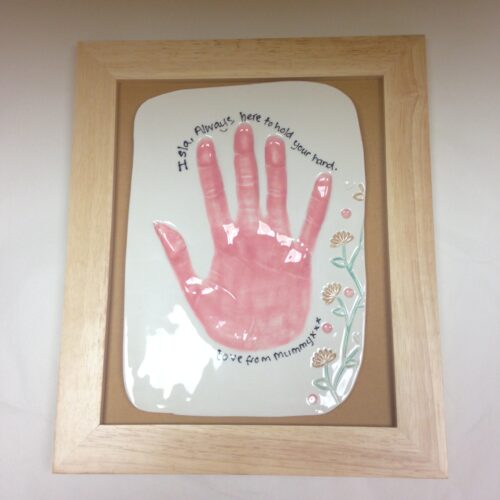 If you prefer some texture to your baby print keepsake then an imprint in clay is for you. This version is usually easier to do when you have a small baby who likes to scrunch up their hand. Scrunched up hands make glazed prints more of a challenge where as clay ones are often more straight forward for us to do.
