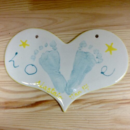 The quickest and simplest baby print keepsake is one that is a print on an item of pottery. Any item of pottery can be used so long as it has a flat surface big enough for the intended print. The cost is just the cost of the item, nothing added on for us to help you.