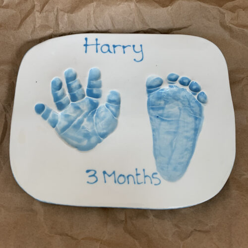 If you prefer some texture to your baby print keepsake then an imprint in clay is for you. This version is usually easier to do when you have a small baby who likes to scrunch up their hand. Scrunched up hands make glazed prints more of a challenge where as clay ones are often more straight forward for us to do.