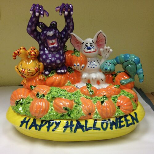 We have several different ceramic pumpkin options which you can paint at home or in the studio. The large and medium pumpkins are made here at the studio and we have cut many different faces so there are lots to choose from.