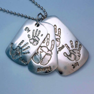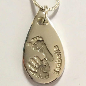 We need a hand or foot print (or paw if you want to get your pet's imprint done). Ideally this is done by us in the studio using our special reactive paper. However, it doesn't have to be, prints for silver jewellery can be taken from virtually any media. Bring them along or email them to us and we will let you know if it can be used.